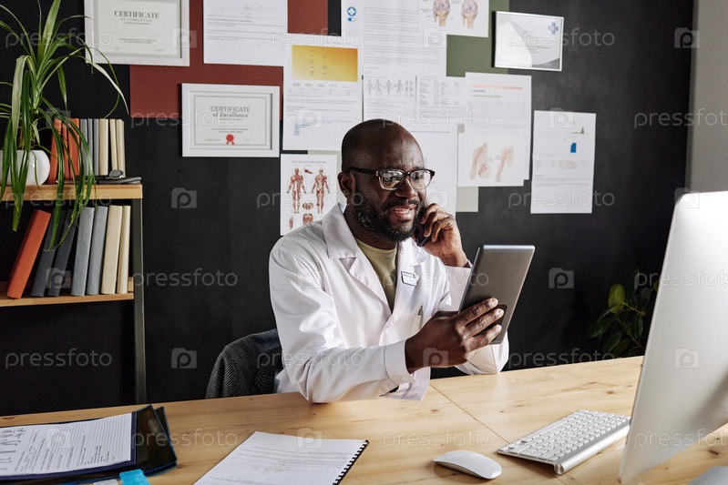 Мужской врач, разговаривающий по мобильному телефону в офисе