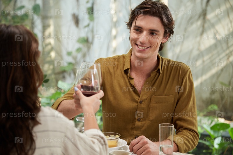 Улыбающийся молодой человек пьет вино на романтическом ужине с девушкой