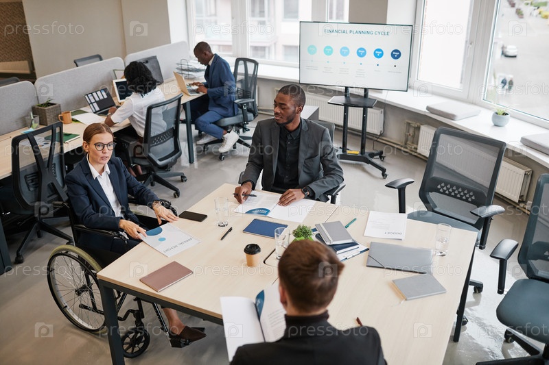 Женщина-менеджер использует инвалидное кресло на совещании