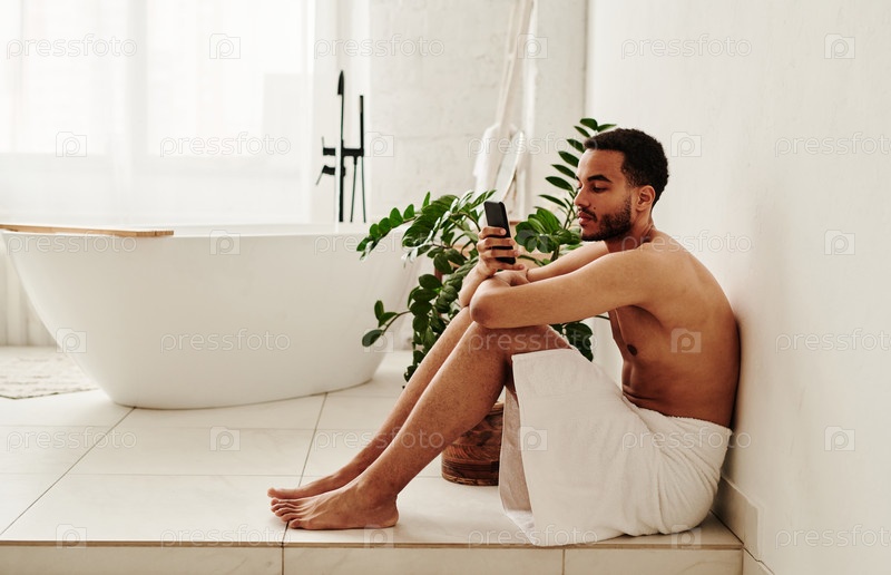 Мужчина, использующий мобильный телефон в ванной комнате