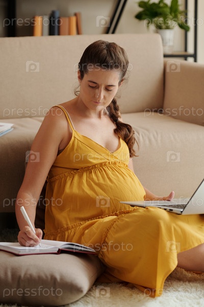 Беременная женщина использует ноутбук дома