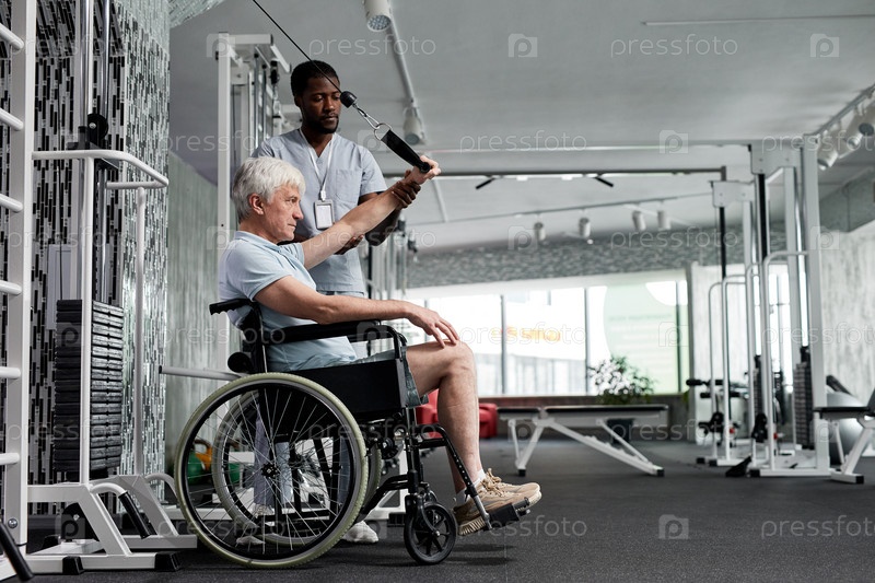 Мужчина в инвалидной коляске на реабилитационном тренажерном зале