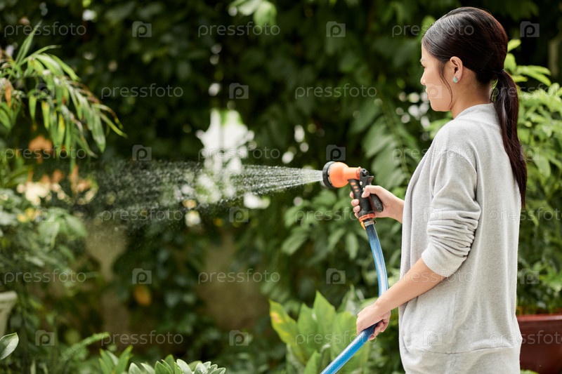 Женщина поливает растения в заднем дворе