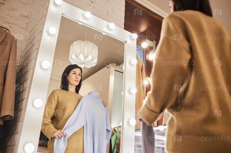 Небольшой угол взрослая женщина смотрит в зеркало, пытаясь надеть одежду в бутике