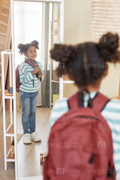 Черная девушка смотрит в зеркало первый день школы и держит рюкзак
