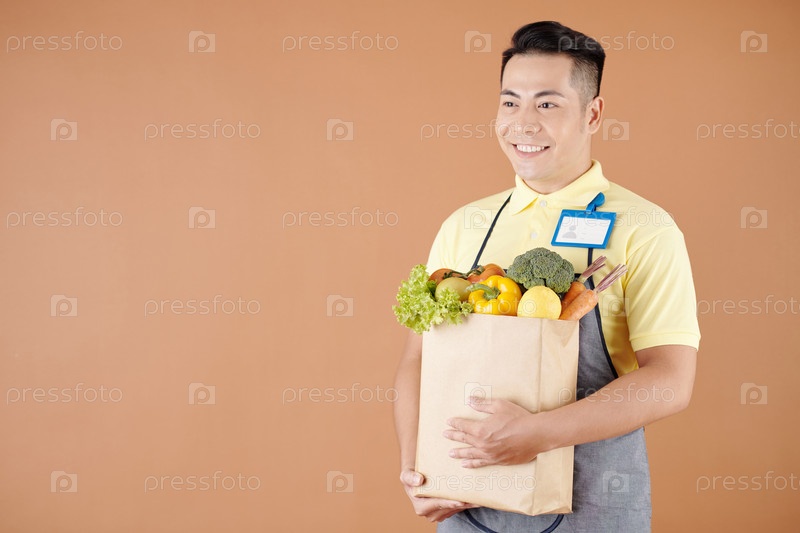 Работник темного магазина, несущий продукты