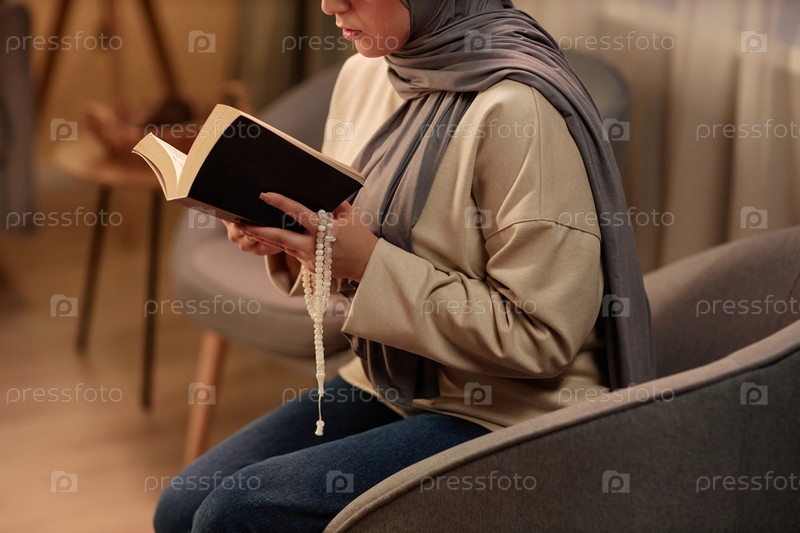 Боковой вид молодой мусульманки, сидящей в сером кресле и читающей Коран