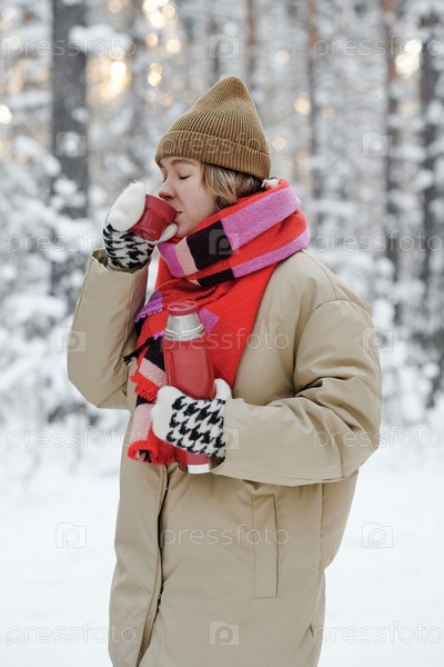 Женщина пьет чай на пикнике на свежем воздухе