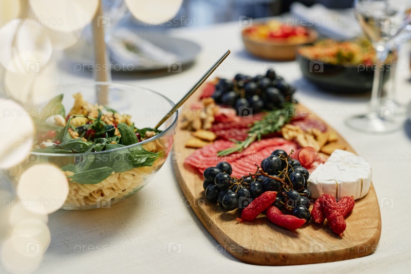 Деревянная доска со свежими виноградами и саламом стоит на подаваемом столе