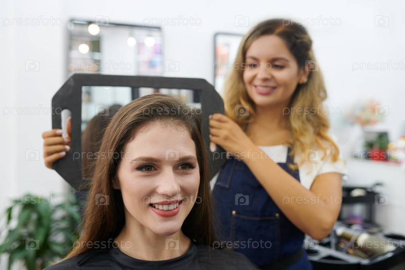 Парикмахерка показывает клиенту заднюю часть волос