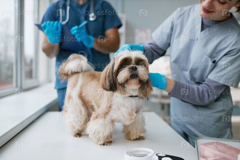 Милая собака стоит на медицинском столе, в то время как женщина-ветеринар осматривает его