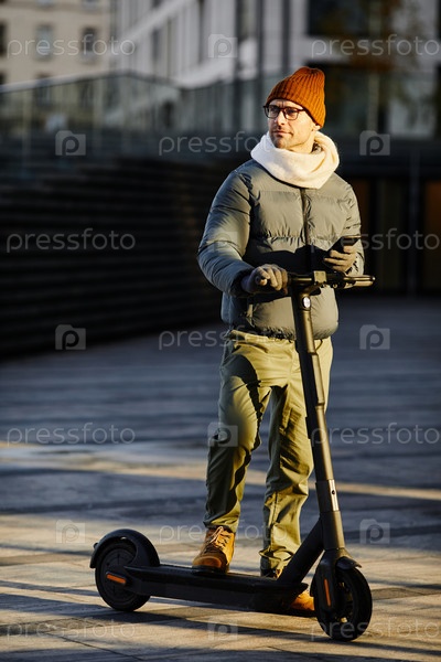 Мужчина соединяет скутер и мобильный телефон
