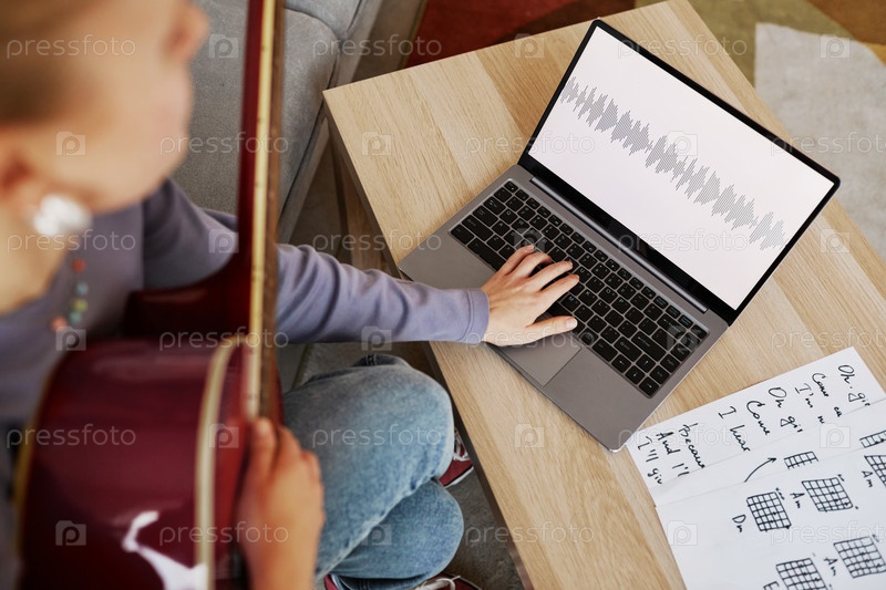 Женщина, записывающая гитарные песни с ноутбуком