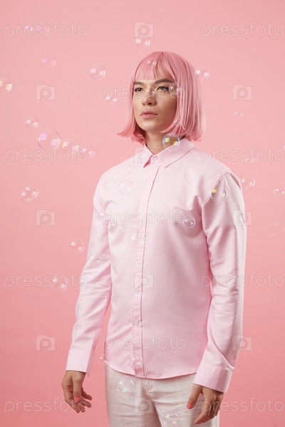 Человек, стоящий под падающими мыльными пузырями