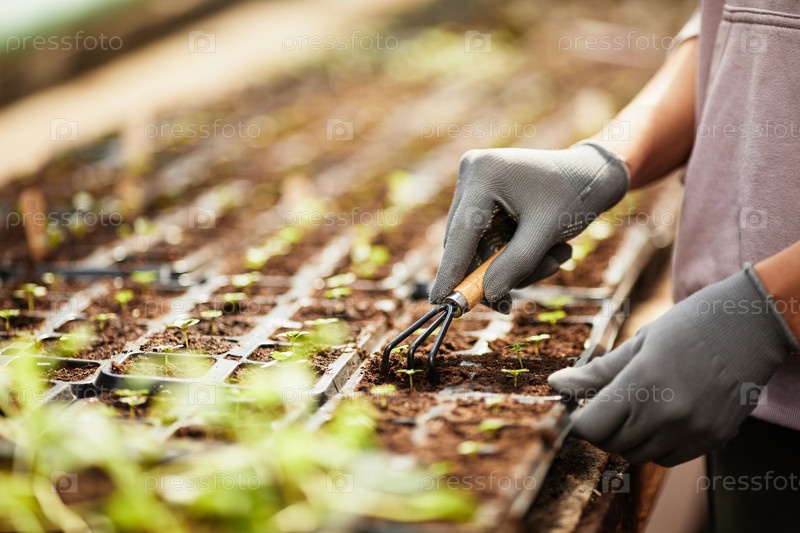 Перчаточные руки молодого современного садовника, расслабляющего почву в торфяных горшках