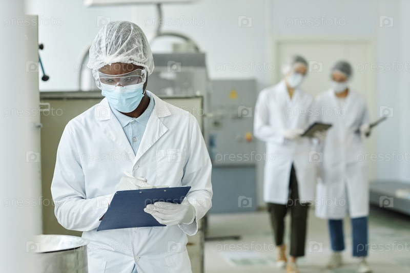 Молодой чернокожий мужчина в маске и держащий клипборд на фабричной мастерской