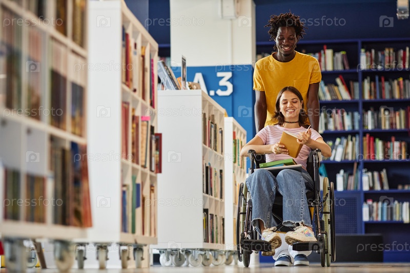 Молодой человек помогает студенту-инвалиду в библиотеке