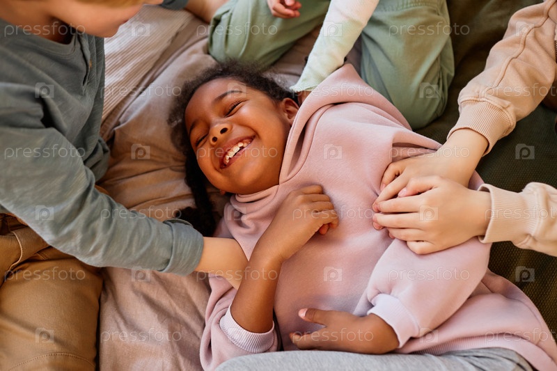 Разнообразная группа детей, играющих и щекочущих улыбающуюся черную девочку
