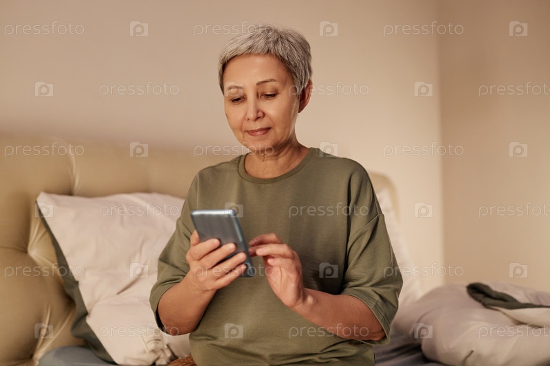 Пожилая женщина использует смартфон, сидя в постели дома