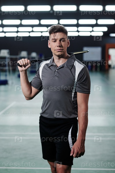 Спортсмен позирует с ракетой для бадминтона