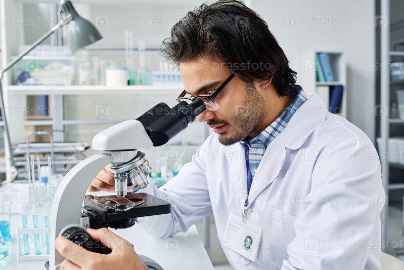 Молодой серьезный клиницист-мужчина в лабораторном пальто и очках смотрит под микроскопом