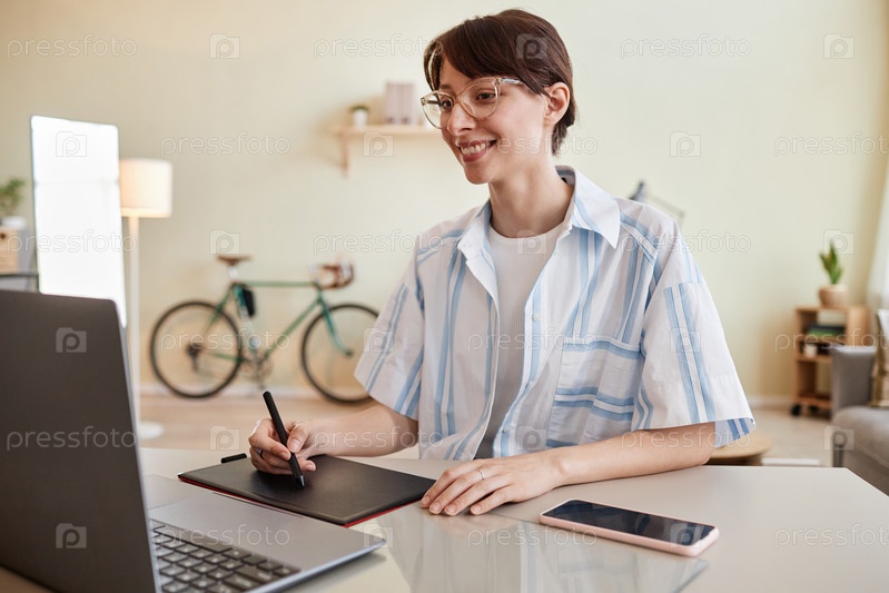 Женщина, использующая ручку-таблет на домашнем офисном рабочем месте