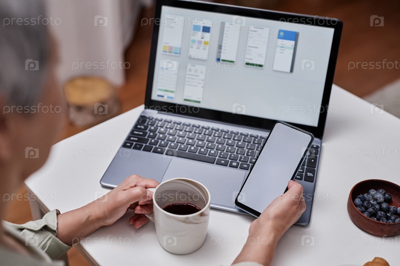 Пожилая женщина, использующая смартфон с пустым белым экраном и ноутбуком