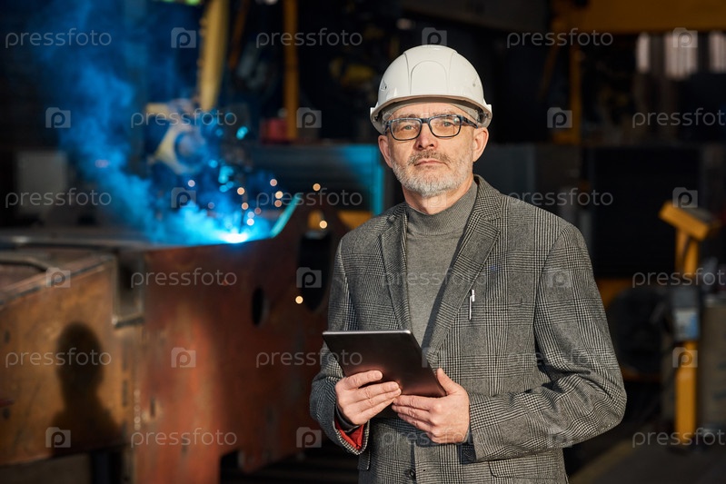 Форман с планшетным компьютером, работающий на фабрике