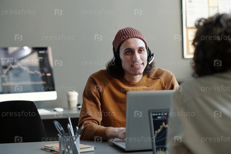 Молодой бизнесмен с наушниками смотрит на коллегу во время общения