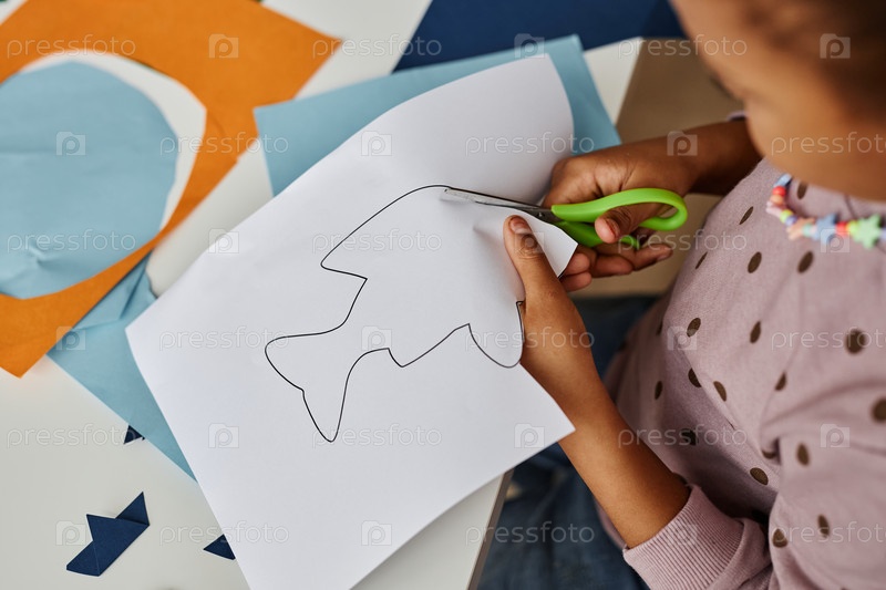 Выше снимок маленькой девочки, режущей рыбу с контурами, нарисованными на белой бумаге