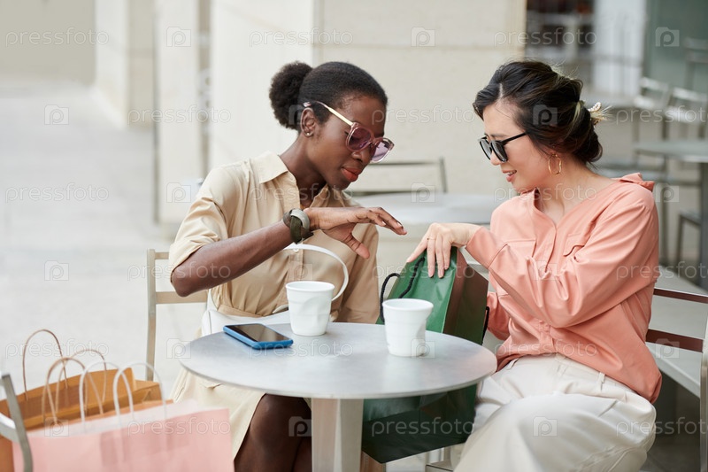 Женщина показывает друзьям свои покупки, когда они сидят в кафе после покупок
