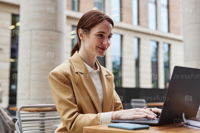 Молодая улыбающаяся брюнетка-бизнесменка, сидящая перед экраном ноутбука