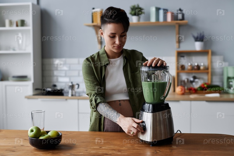 Беременная молодая женщина делает смузи на завтрак в домашней кухне