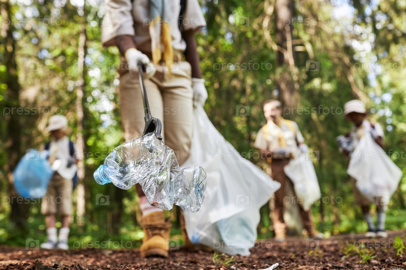 Ближайшее изображение скаутов, собирающих мусор в лесу