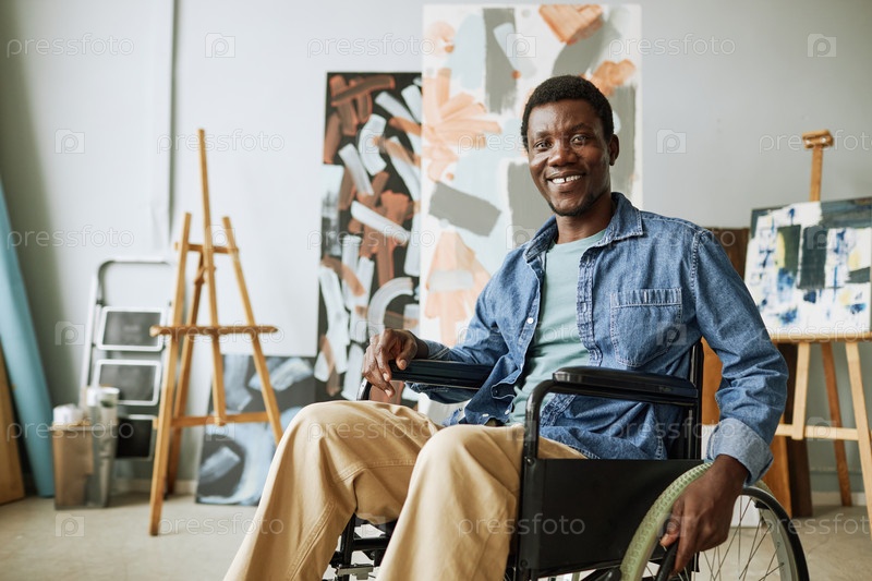 Молодой успешный художник в повседневной одежде сидит на инвалидной коляске перед камерой