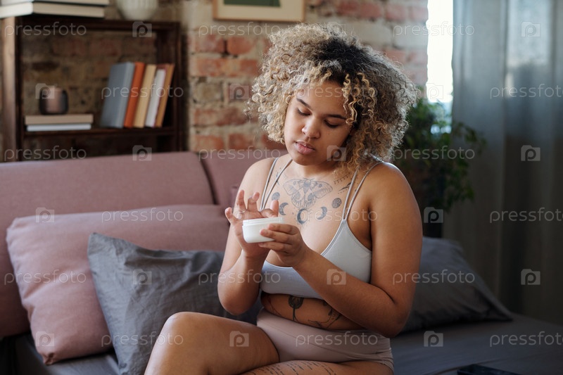 Молодая спокойная женщина в нижнем белье, сидящая утром на кровати