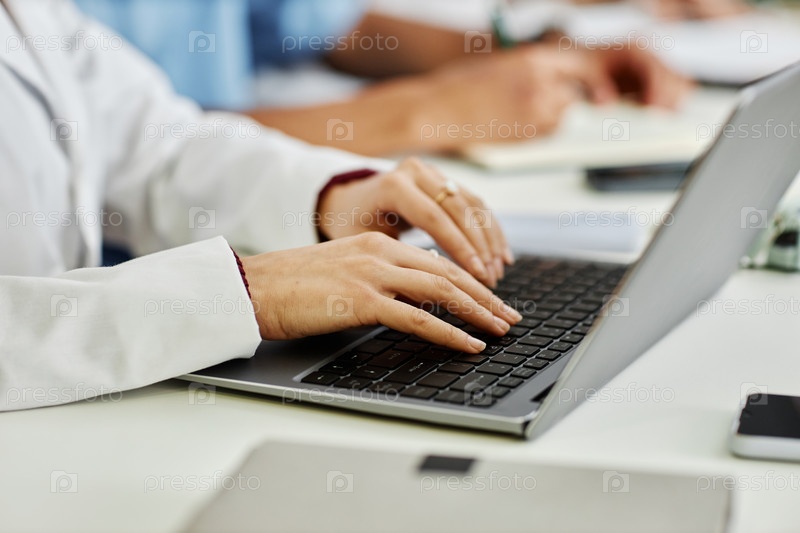 Близкий снимок молодой женщины-врача, печатающей на клавиатуре ноутбука во время медицинского семинара