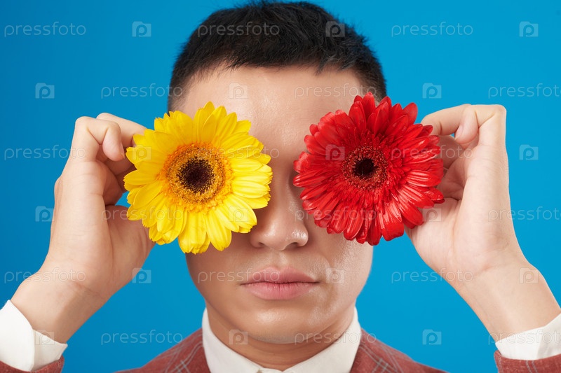 Человек, покрывающий глаза цветами