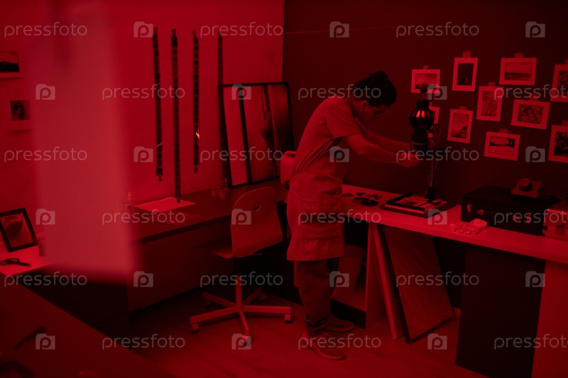 Профессиональный фотограф, работающий с фотографиями в темной комнате