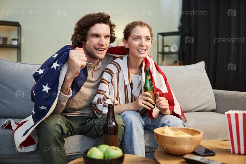 Эмоциональная пара с американским флагом смотрит на спортивный матч дома