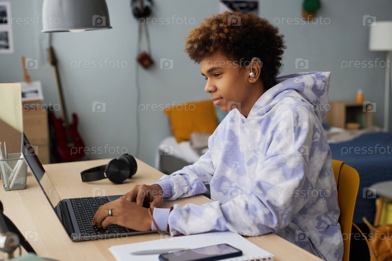 Умный подросток в повседневной одежде печатает и смотрит на экран ноутбука