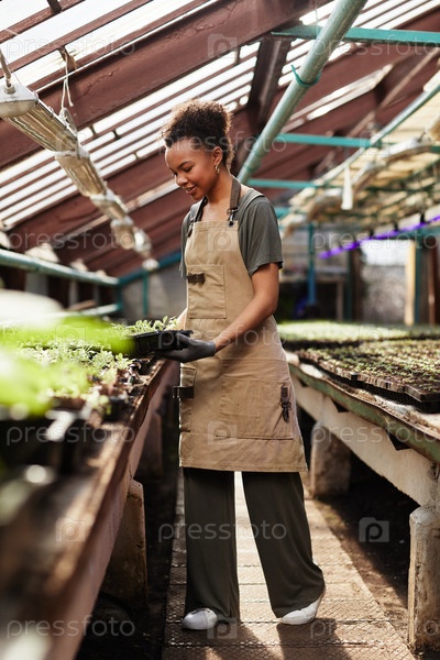 Молодая привлекательная садовница ухаживает за саженцами различных растений