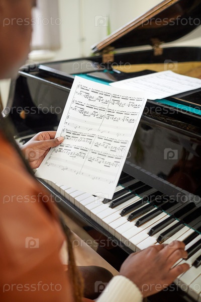 Женщина учится играть по нотам