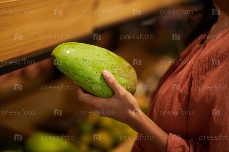 Женщина, покупающая зеленые манго