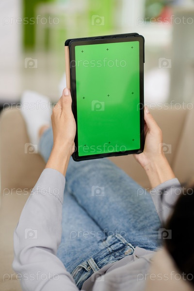 Цифровой планшет с пустым зеленым экраном в руках молодой спокойной женщины
