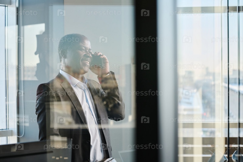 Счастливый зрелый директор бизнес-компании разговаривает со своим смартфоном