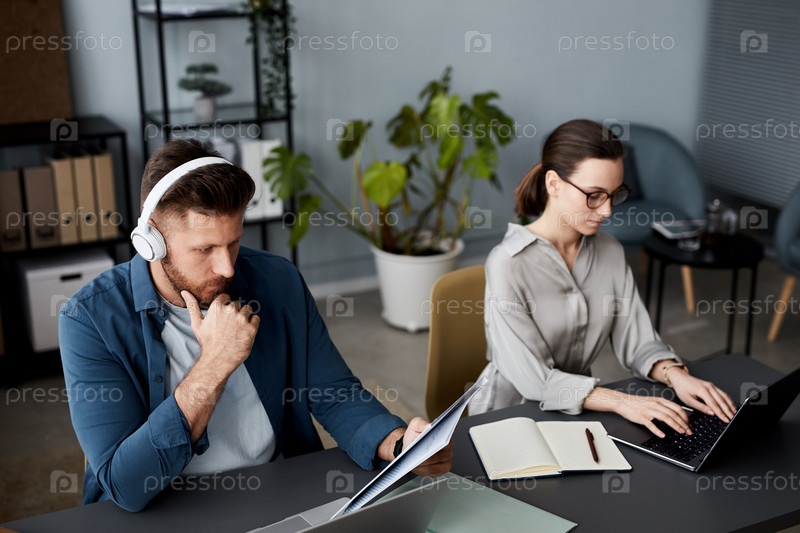 Молодой серьезный бизнесмен просматривает документы, пока его коллега печатает