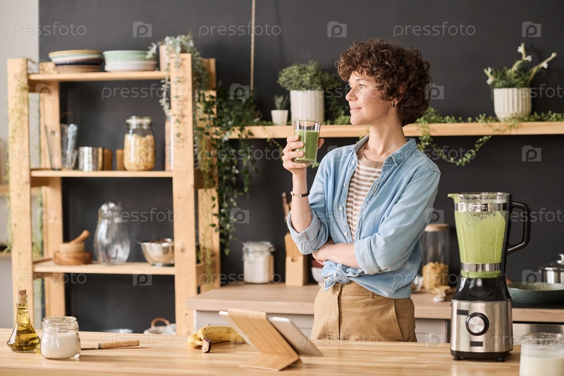 Девушка пьет свежий смузи на кухне