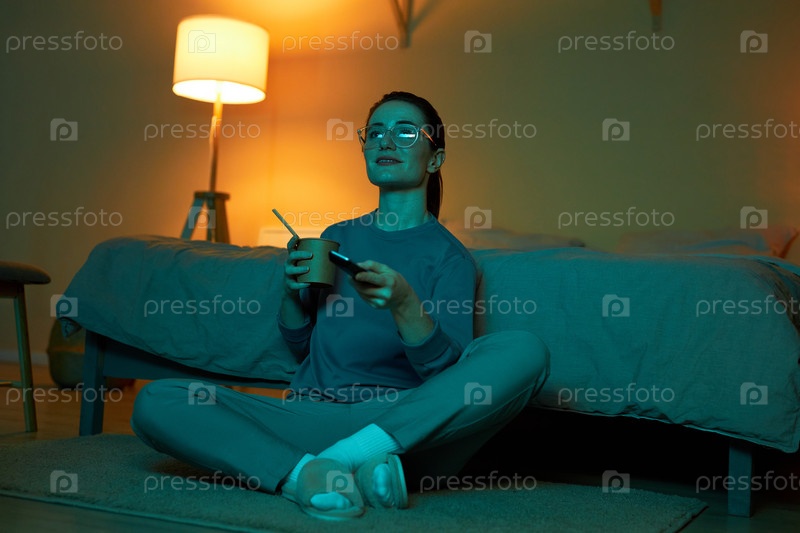 Молодая женщина смотрит телевизор в темноте и ест лапшу, сидя на полу
