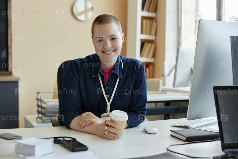 Молодая красивая ИТ-менеджерка с чашечкой кофе в руке сидит у рабочего места